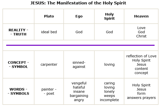 This only makes sense when we understand the content that lies beneath the form, beneath the symbol. The great emphasis in the workbook—which is a mind-retraining program—is on listening to the Holy Spirit's Voice as a correction for what the ego has been telling us about the Holy Spirit. At the lowest level in the ego column on the chart, the ego's message basically is, "Don't ask God for help because God will destroy you. And even if the Holy Spirit is a kind Voice, there's no way He'll pay any attention to you, because you're so unworthy. The Holy Spirit will only speak to certain people." And so, if I am Roman Catholic, for example, those certain people are the priests. But every formal religion has its hierarchy of special people. So Jesus attempts to correct this error on the level at which we experience it, by telling us that the Holy Spirit speaks to all of us all the time. God does not play favorites. God does not love one person more than another.
